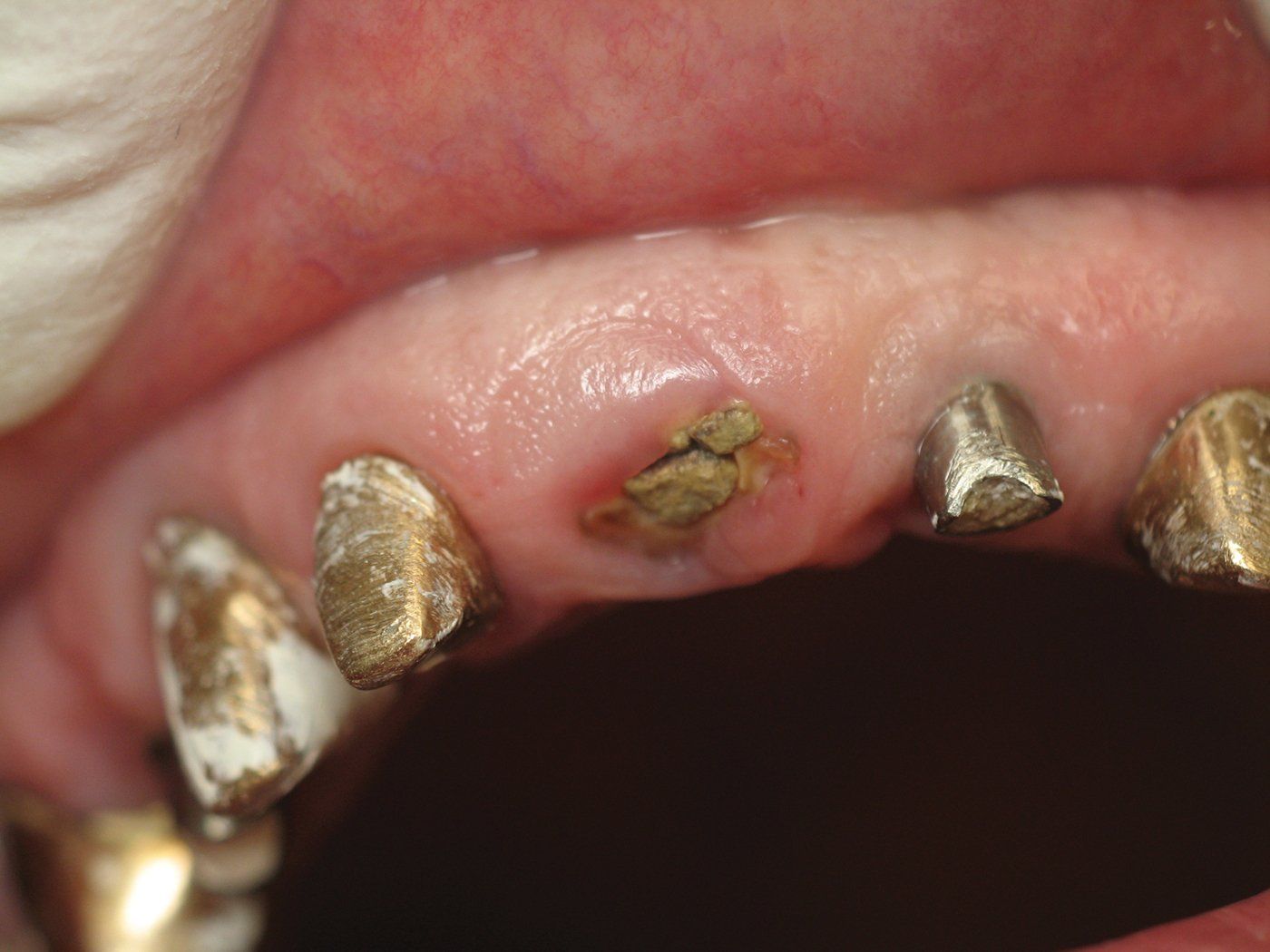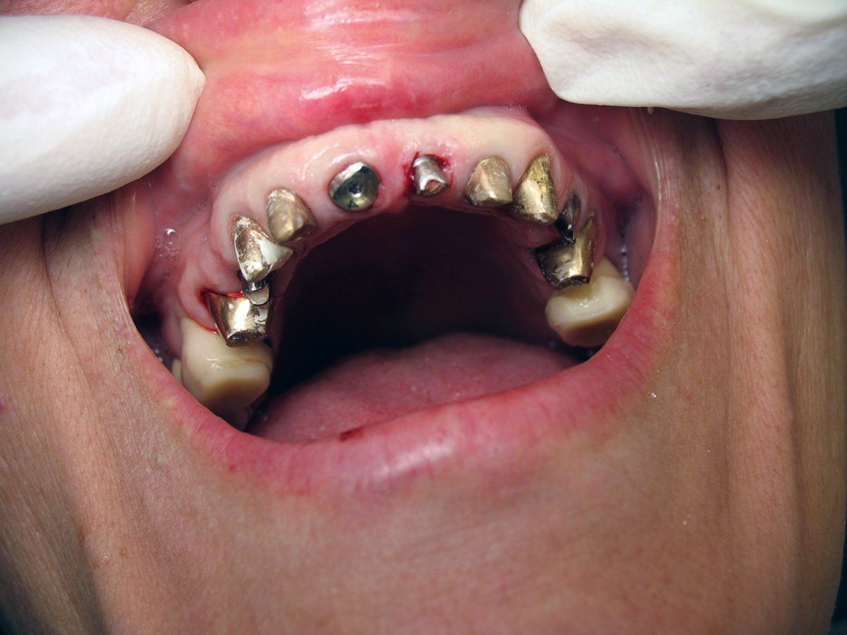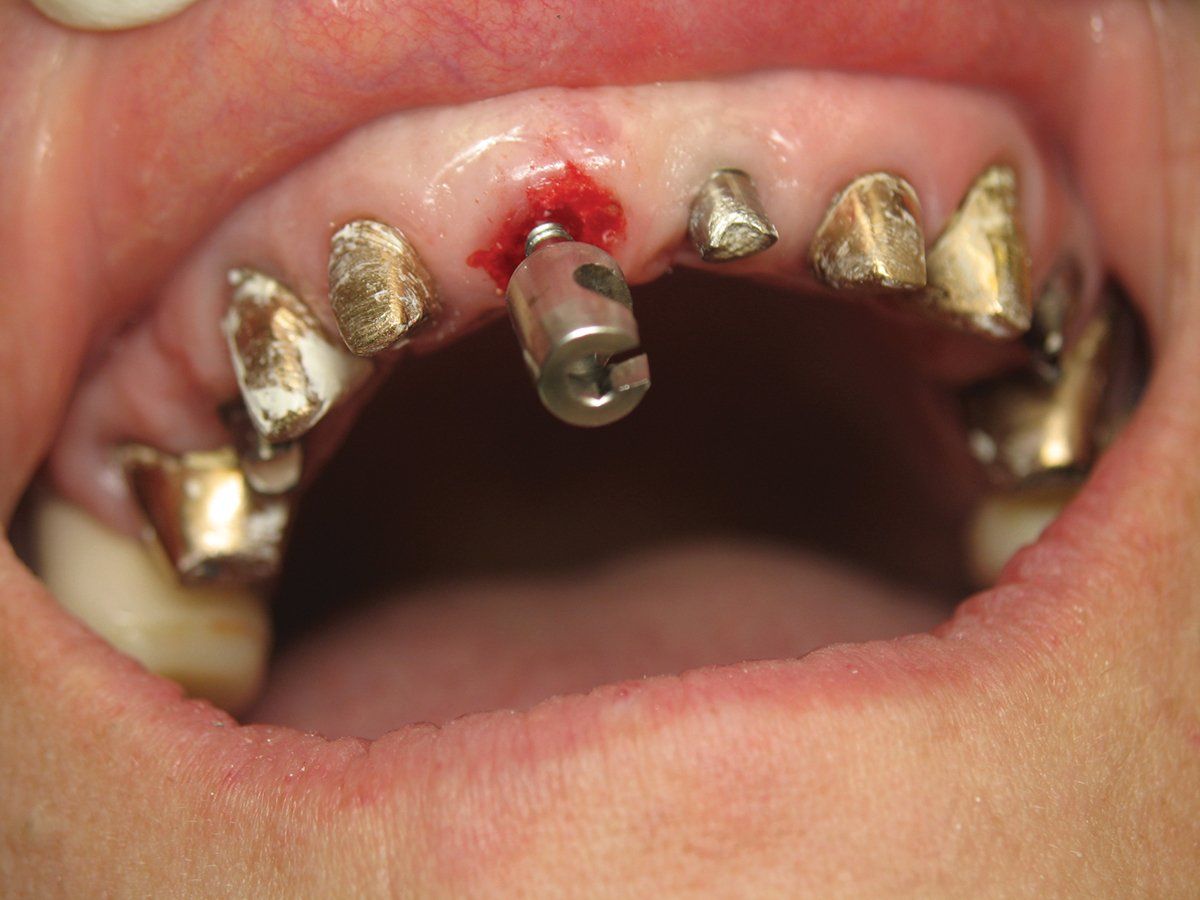After placing the implant and filling the small buccal gap between the implant and the bone with a bone graft, I placed a 3-mm healing screw to maintain the gingival anatomy. As you can see (Figure 6) the soft tissue anatomy is identical to the pre-op photo. The patient will wear her temporary bridge for the next three months, at which point a final prosthesis, including the implant in position number 8 will be fabricated.
