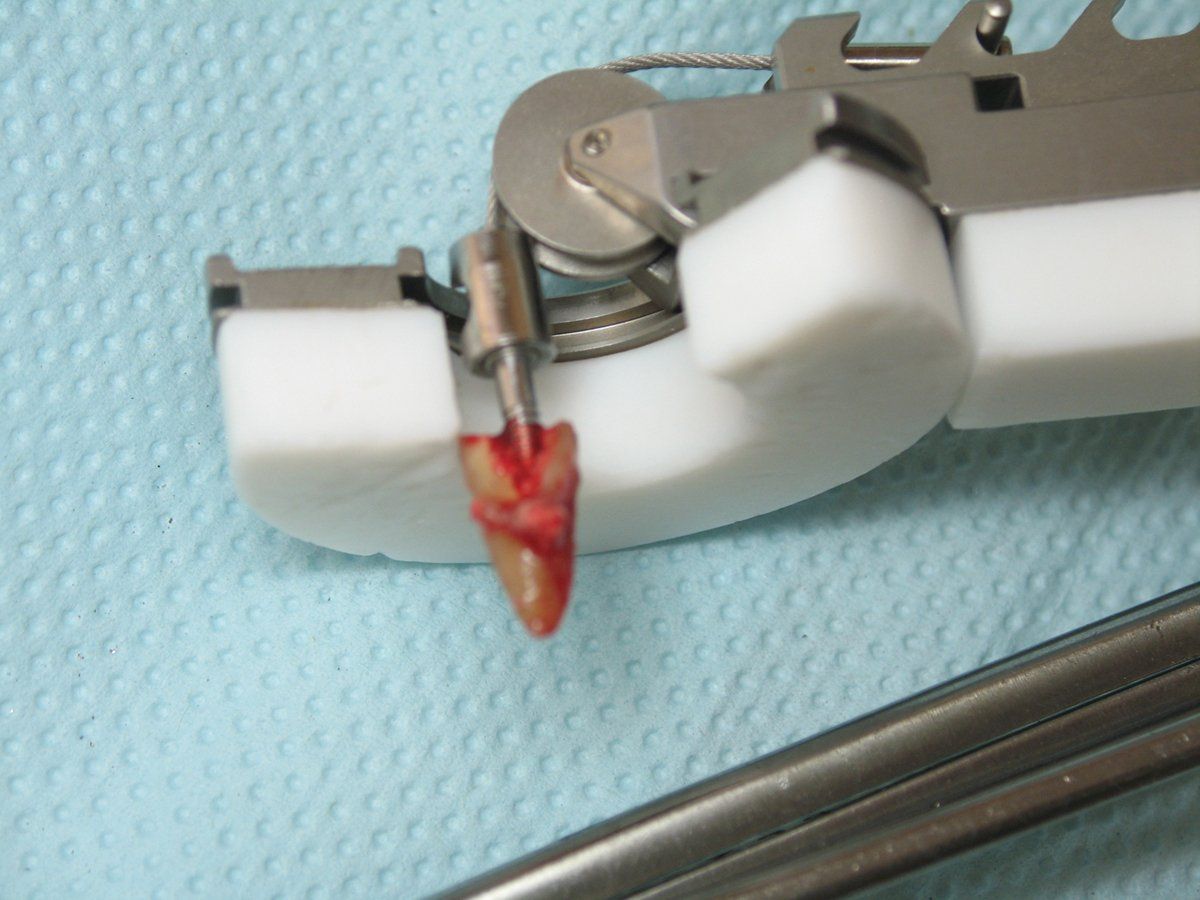 The specific technique involves using a special bur to drill into the pulp chamber and then threading a matching anchor into the tooth (Figure 3). A pulley system is utilized and a protective bite plate rests on the adjacent teeth and is attached to the anchor via a braided cable. By rotating a knob at the end of the instrument, pressure is applied in the vertical axis of the root. As you gently increase the pressure to the cable, it allows the periodontal ligament to stretch. The root is extracted from the socket when sufficient pressure is applied, making a popping noise (Figures 4). When this works, it feels like magic. Left behind is an intact socket with the soft tissue and bone preserved and ready for immediate placement of a dental implant (Figure 5).